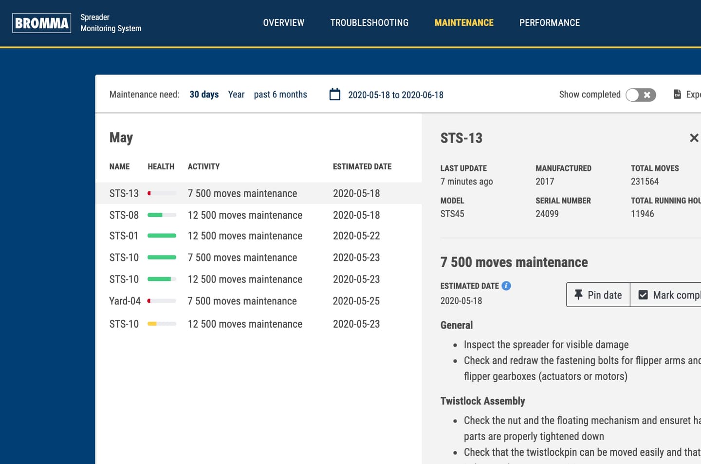Bromma SMS is a modern, data-driven tool that can radically increase terminal efficiency, both in the short and long term. SMS helps spot declining spreader performance and other negative trends early and allows ports to address them before they become a problem - in real-time and without physical inspections. Longer spreader life cycles, optimal energy consumption, and less travel for maintenance all increase sustainability.